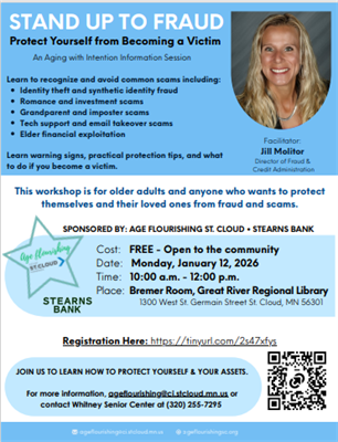 Facilitator Jill Molitor, Director of Fraud & Credit Administration at Stearns Bank will help you learn to recognize and avoid common scams, including: